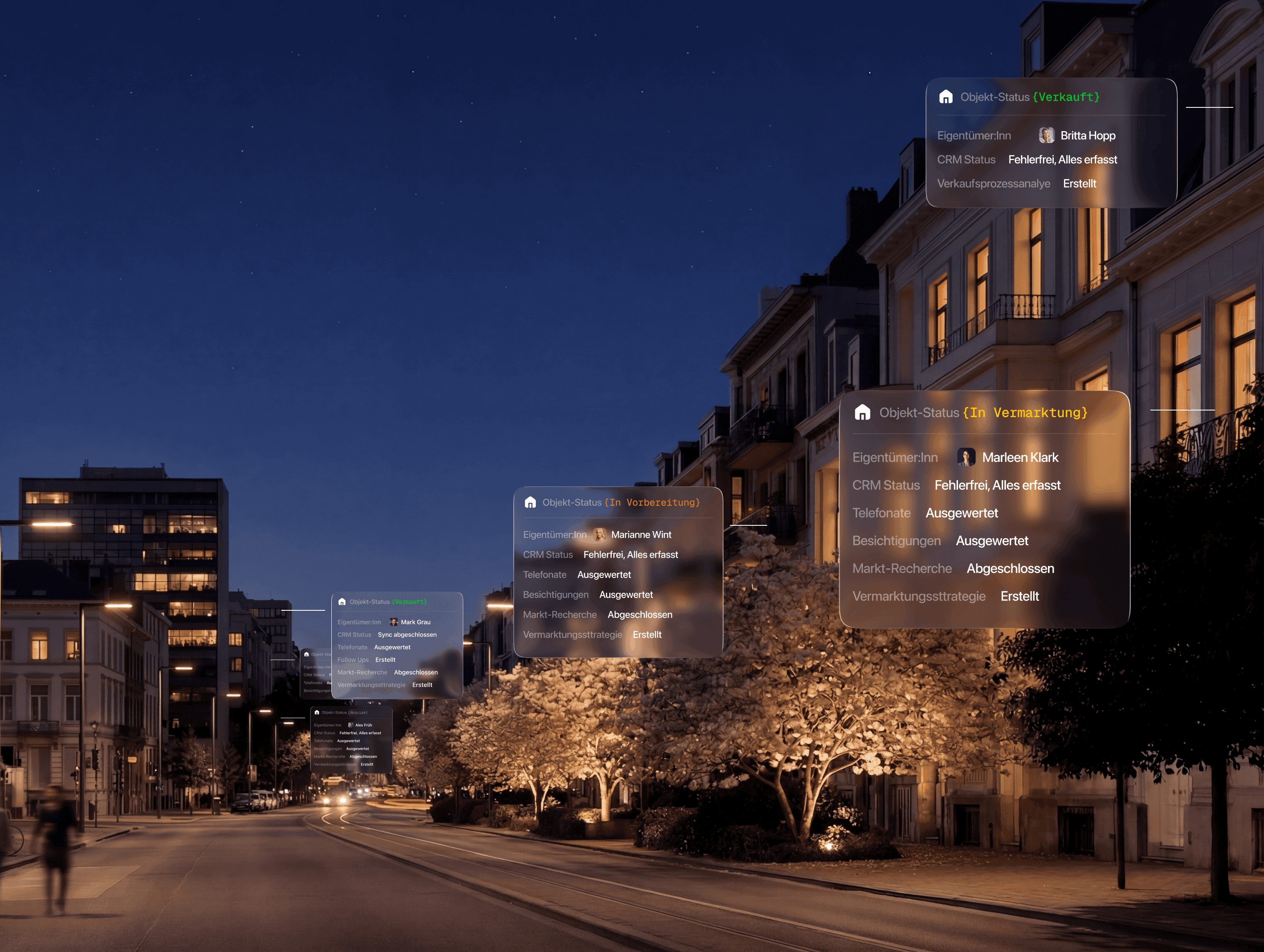 Ein System, das von der ersten Lead-Anfrage bis zum Abschluss durchläuft. Das deinen Akquisiteuren den richtigen Lead zur richtigen Zeit zeigt. Das Follow-ups auslöst, bevor jemand daran denken muss. Das Exposés baut, während dein Makler schon beim nächsten Termin ist. Das dir als GF zeigt, wo Umsatz entsteht und wo er liegen bleibt.